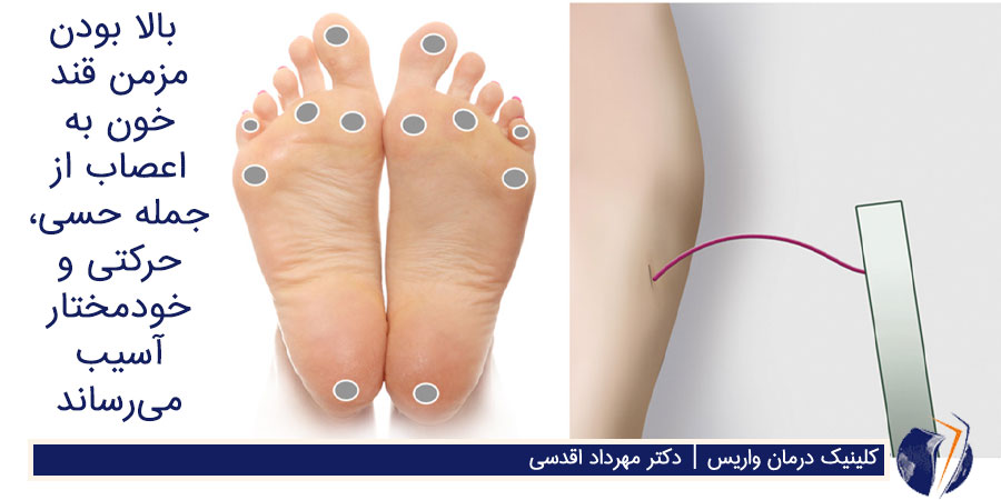 تخریب عصب نوروپاتی در این عارضه حس درد در زمان ایجاد زخم یا تاول در پاها از دست میرود و بیمار متوجه زخم